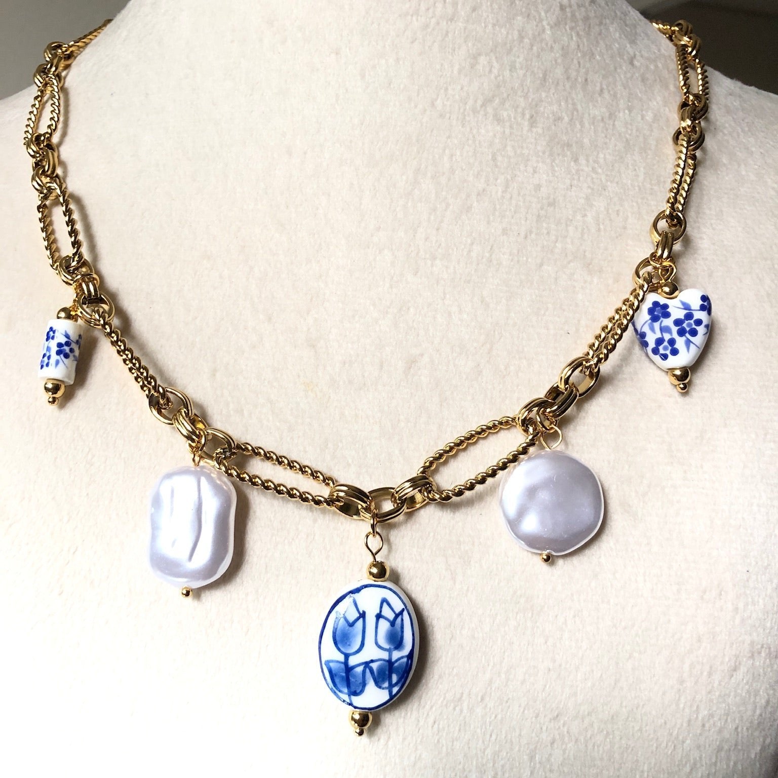 Carefully handpicked multi charm necklace featuring: handpainted ceramic China beads & freshwater pearls on a 18k Gold Plated linked chain.
