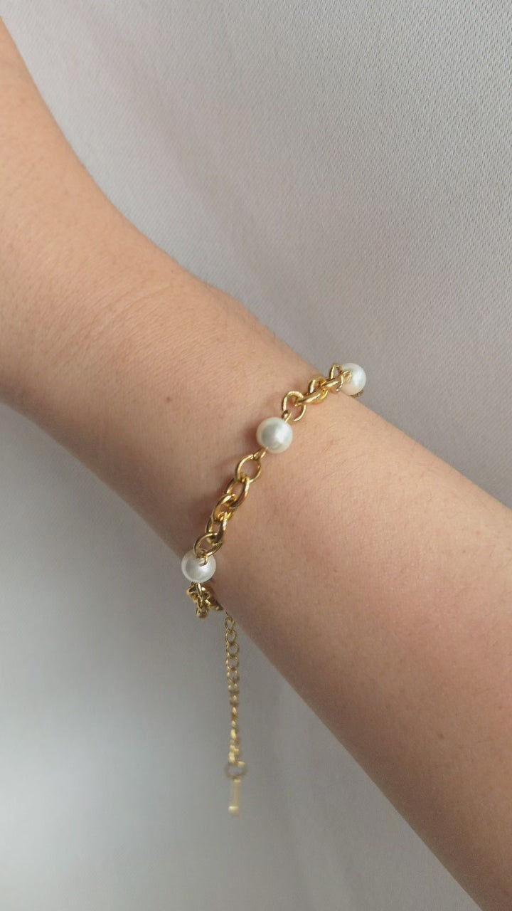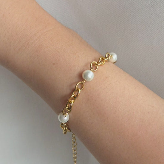 A delicate double-chain design adorned with lustrous freshwater pearls and gold accents.